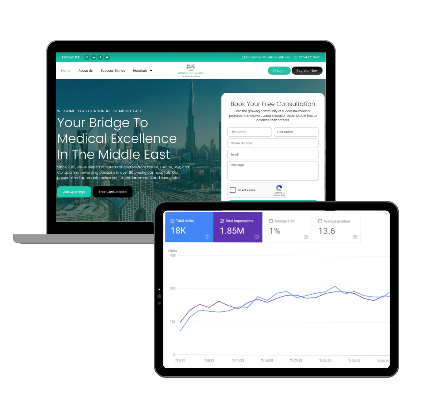 We stepped in with a focused SEO plan: fixing technical errors, improving site speed, and optimizing content to target local search. The Google Business Profile was updated and monitored, and performance data from Search Console and GA4 guided ongoing improvements. In just 55 days, Allocation Assist recorded over 8,000 clicks, nearly 800 active users, and a surge in business profile activity — including 1,400+ call clicks and more than 570 direction requests. With technical SEO resolved and content aligned with search intent, visibility improved quickly. The result was consistent growth in traffic and stronger user engagement across the platform.