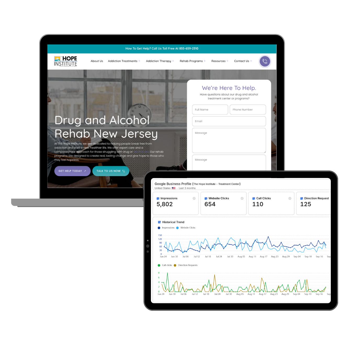 We delivered a complete SEO strategy — fixing technical issues, optimizing content, and strengthening local search. Within three months, results were clear: 4,500+ organic clicks, 615,000 impressions, and over 125 calls and direction requests through Google Business Profile. Analytics showed sitewide traffic growth, improved keyword rankings, and higher engagement from the right audience. By aligning content with search intent and optimizing for local visibility, The Hope Institute built sustainable momentum and captured more leads from organic channels. The new SEO framework set them up for continued growth and stronger patient admissions.